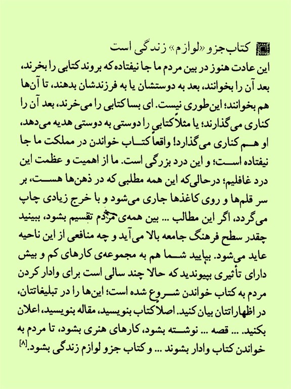 کتاب مقوله بسیار مهمی است. البته من به کارهای هنری و تصویری- تلویزیون، سینما، یا این قبیل چیزها-خیلی اعتقاد دارم. اما کتاب نقش مخصوصی دارد. جای کتاب را هیچ چیزی پر نمی کند. کتاب را باید ترویج کرد... مردم باید به کتابخوانی عادت کنند و کتاب وارد زندگی بشود.